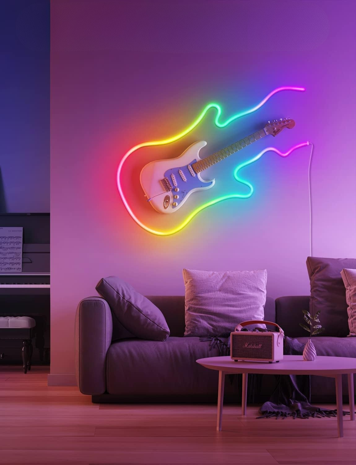 Indoor use recommended; ventilate power/control units. Wipe with a dry cloth. Do not submerge. Respect minimum bend radius for the neon strip (≈2–3 cm).